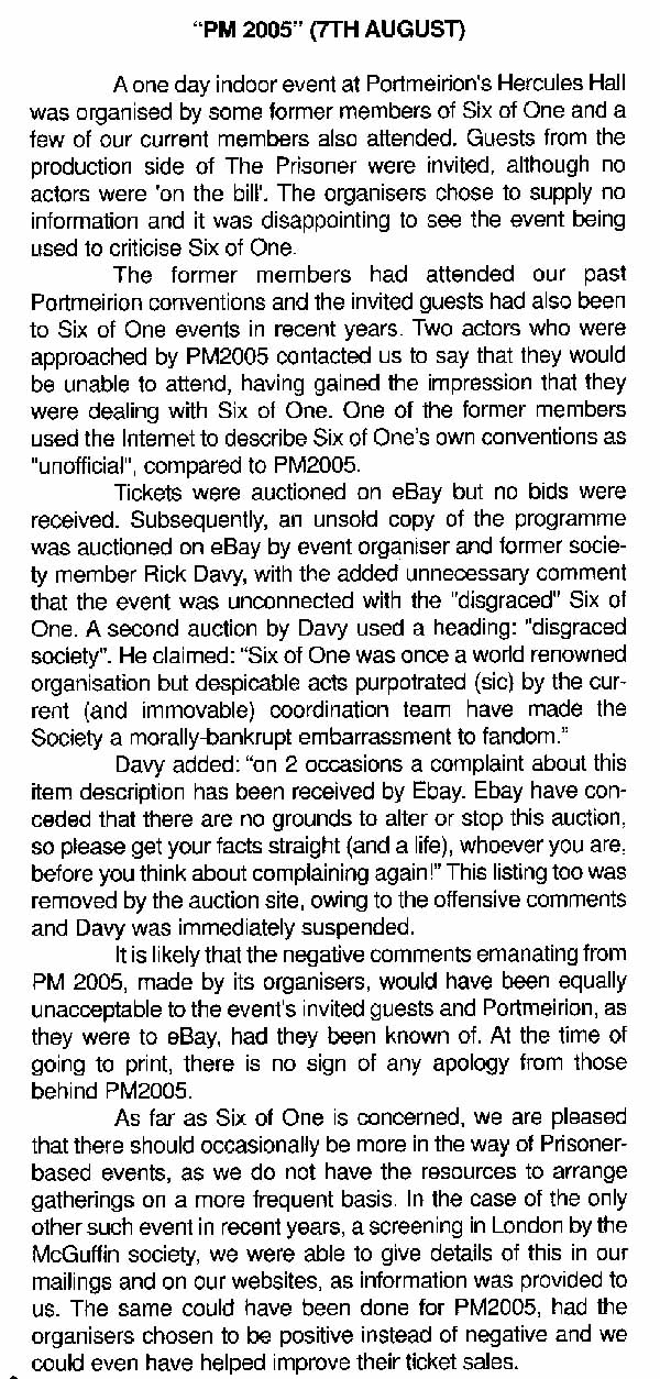 In October 2005, Six of One decided to attack the charity event, and its organisers, in its mailing. Reproduced below is the article in question. Click HERE to view PM2005 / The Unmutual Website's official response to these unfounded and unpleasant allegations.